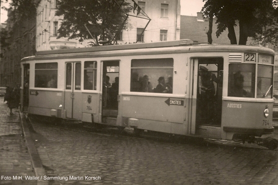 Triebwagen 764, Typ M1.62, steht im Oktober 1950 als Linie 22 auf der Kehrschleife Münchner Freiheit zur Fahrt Richtung Hofmannstraße bereit. Links ist die Haimhauserstraße zu sehen. Der Wagen wurde 1960 zum Fahrschulwagen 23, später 2923, umgebaut und erst 1976 ausgemustert.