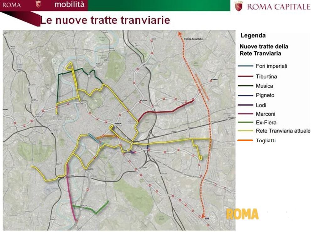 Geplant war eine Strecke von der Piazza Vittorio zum Largo Corrado Ricci, entlang der Via Cavour, mit möglicher Verlängerung auf die Via dei Fori Imperiali. Eine Linie auf der Viale P. Togliatti und eine zwischen der Piazzale del Verano und dem Bahnhof Tiburtina. Und schließlich die sogenannte „Musik“-Straßenbahn sowie die Option einer Straßenbahn auf der Viale Marconi. Dies waren die Pläne der Verwaltung. In der Sitzung der commissione capitolina Trasporti stellten Techniker der Agenzia Roma servizi per la mobilità die laufenden Projekte vor. Die Gesamtausgaben für die vier Linien wurden mit mehr als 300 Millionen Euro dargestellt. Einige, wie die Straßenbahn auf der Tiburtina und der Via Cavour, sollten aus dem kommunalen Haushalt finanziert werden. Andere Linien, wie die auf der Viale Togliatti, die allein 200 Millionen € kosten sollte oder die „Musik“-Straßenbahn, die ein wenig mehr als 40 Mio. € kosten sollte, sollten mit EU-Mitteln oder über den Staat und die Region finanziert werden.