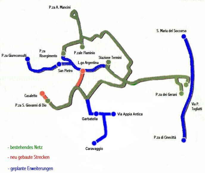 Die positiven Erfahrungen mit der Renaissance der Trambahn, gaben ab Mitte der 1990er Jahre den Anstoß für mehrere Projekte zur Erweiterung des bestehenden Netzes. Charakterisiert wurden alle Projekte durch die Ungewißheit ihrer Ausführung. Der Stadtrat von Rom hatte Anfang des Jahrtausends einen Vorstoß unternommen, im Stadtzentrum den mit Diesel betriebenen Öffentlichen Verkehr durch Elektrischen zu ersetzen.Doch entgegen aller Hoffnungen, dass dieser Beschluss dazu beitragen würde, diese Tram-Erweiterungsprojekte auch auszuführen, blieb es bei bloßen Ankündigungen und Versprechungen. Lediglich die Verbindung zwischen Termini und Largo Torre Argentina wurde weiter geplant und eine kleine Verlängerung zur Piazza Venezia am 06. Juni 2013 in Betrieb genommen.